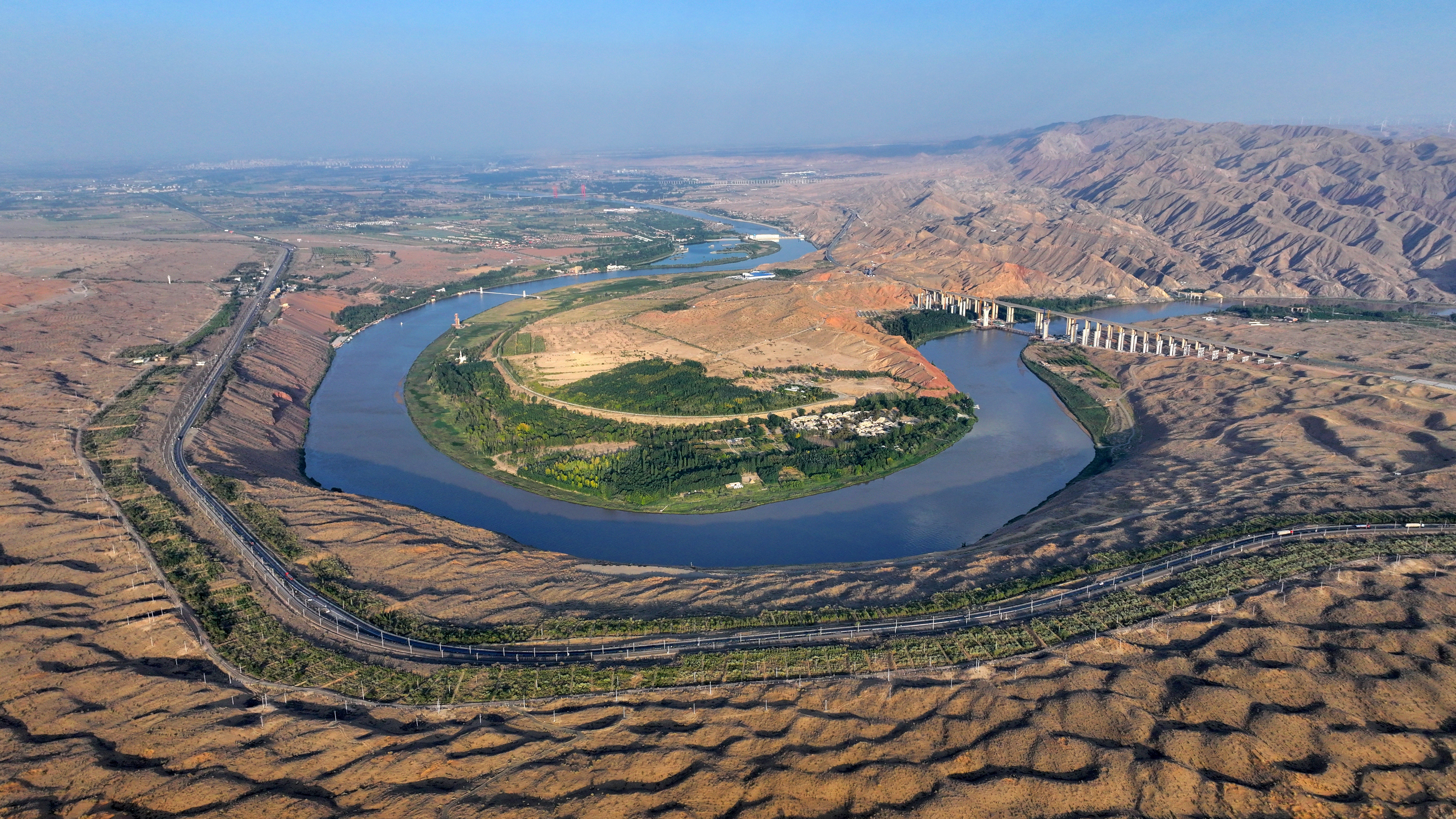 如今,在當(dāng)?shù)赜嘘P(guān)部門開展的水系疏浚工程影響下,這里成為沙漠濕地的聚集地。黃河流經(jīng)此地,畫出了一道蜿蜒的曲線。河的一頭是騰格里沙漠的無垠瀚海,另一頭被一抹蒼翠鑲嵌在河岸邊。