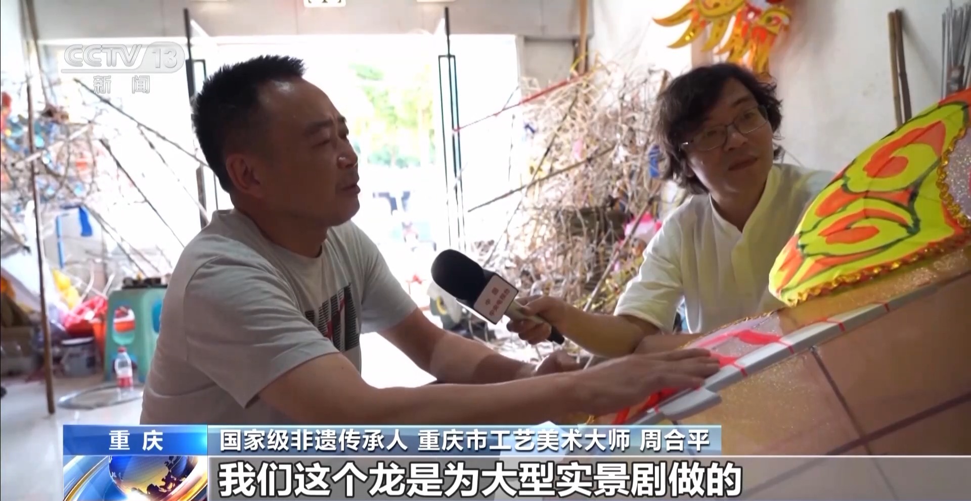這件精美的龍燈彩扎藝術(shù)品,名叫《飛龍?jiān)谔臁?,是由非遺傳承人周合平歷時(shí)3個(gè)月完成的,馬上就要送往北京,收藏在中國(guó)非物質(zhì)文化遺產(chǎn)館。在這間扎龍工作室里,記者看到,大家正在趕制一批表演用的龍燈。