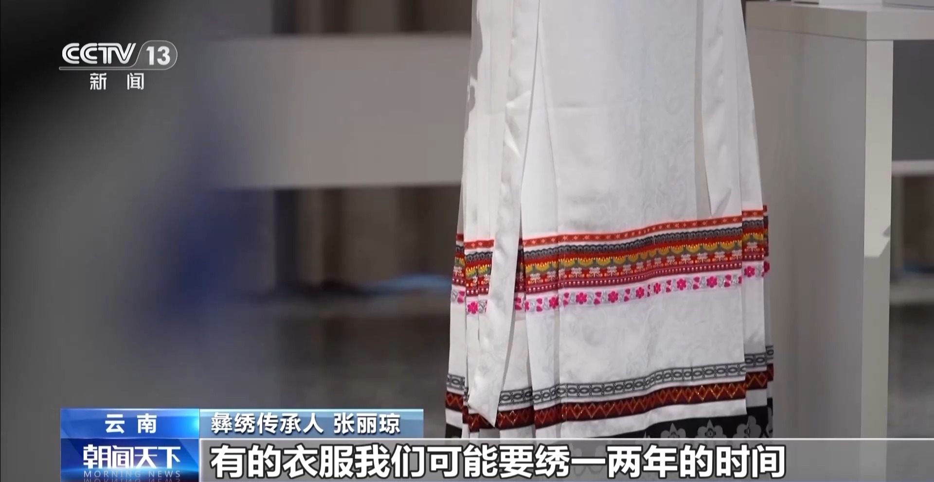 彝繡傳承人 張麗瓊:有的衣服我們可能要繡一兩年的時(shí)間。我們的彝族服飾,一定是有收藏價(jià)值、欣賞價(jià)值、藝術(shù)價(jià)值,它是融合為一體的。