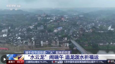 總臺(tái)記者 牟亮:我現(xiàn)在所在的位置就是重慶市銅梁區(qū)的安居古城,在我身后正在進(jìn)行端午節(jié)的非遺文化表演,這是水云龍的表演。10名赤膊的漢子正在舞動(dòng)一條18米的藍(lán)色水云龍,整條龍上下翻騰,左右騰挪,在兩邊明清時(shí)期的老屋之間穿行。而站在兩旁的居民和游客,會(huì)拿著水瓢或者水盆,將清水潑向正在舞動(dòng)的水云龍。雖然水云龍所到之處,大家衣衫都可能打濕,但是大家都樂在其中。