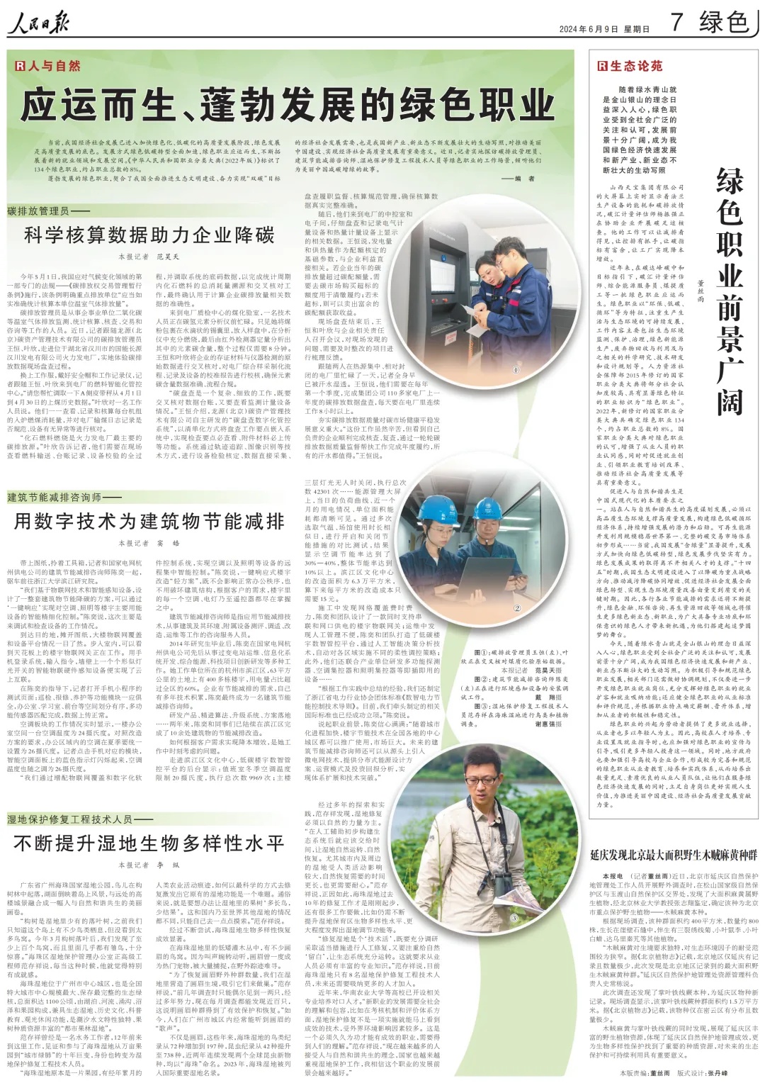 蓬勃發(fā)展的綠色職業(yè),契合了我國全面推進生態(tài)文明建設、奮力實現“雙碳”目標的經濟社會發(fā)展需要,也是我國新產業(yè)、新業(yè)態(tài)不斷發(fā)展壯大的生動寫照,對推動美麗中國建設、實現經濟社會高質量發(fā)展有重要意義。近日,人民日報記者實地探訪碳排放管理員、建筑節(jié)能減排咨詢師、濕地保護修復工程技術人員等綠色職業(yè)的工作場景,傾聽他們?yōu)槊利愔袊鴾p碳增綠的故事。