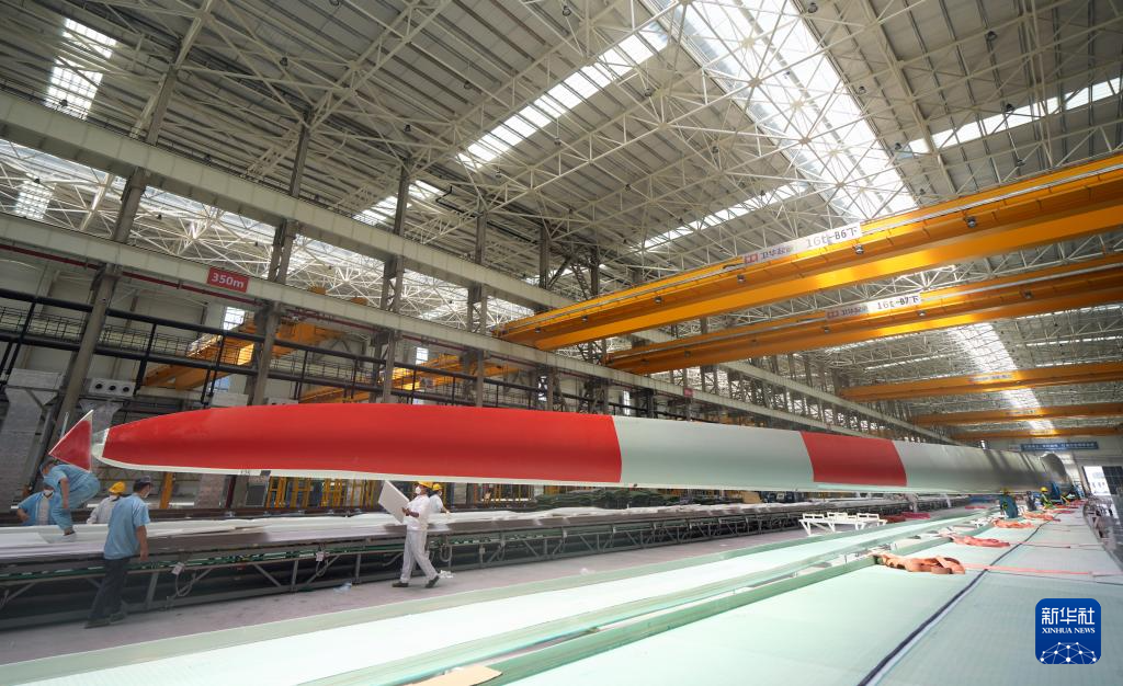 6月6日,在射陽(yáng)中車(chē)風(fēng)電葉片工程有限公司生產(chǎn)車(chē)間拍攝的大型風(fēng)機(jī)葉片。新華社記者 李尕 攝