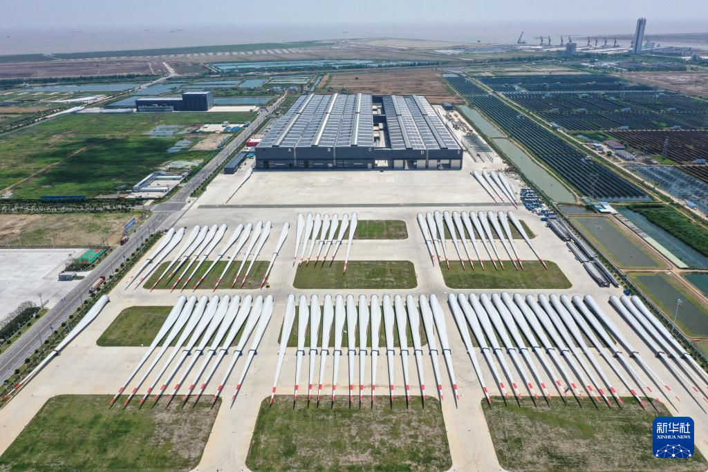 6月6日拍攝的位于射陽(yáng)港低(零)碳產(chǎn)業(yè)園的射陽(yáng)中車(chē)風(fēng)電葉片工程有限公司的外景照片(無(wú)人機(jī)照片)。 新華社記者 楊磊 攝