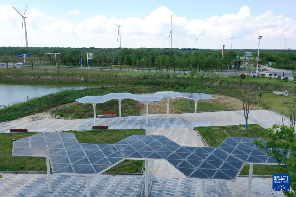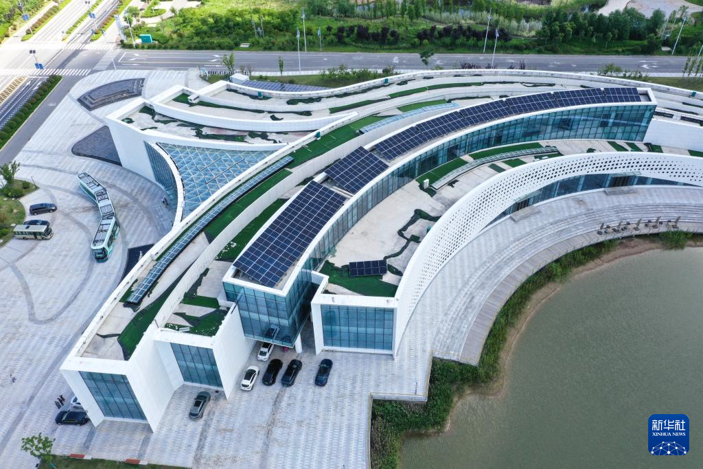 6月6日拍攝的射陽(yáng)港低(零)碳產(chǎn)業(yè)研究院建筑屋頂使用的太陽(yáng)能光伏電能系統(tǒng)(無(wú)人機(jī)照片)。新華社記者 楊磊 攝