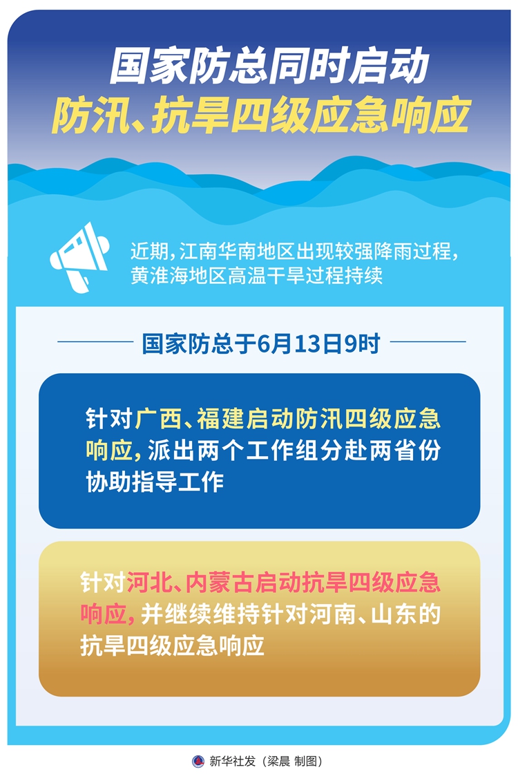 近期,江南華南地區(qū)出現(xiàn)較強(qiáng)降雨過程,黃淮海地區(qū)高溫干旱過程持續(xù)。國家防總于6月13日9時(shí)針對廣西、福建啟動防汛四級應(yīng)急響應(yīng),派出兩個(gè)工作組分赴兩省份協(xié)助指導(dǎo)工作;針對河北、內(nèi)蒙古啟動抗旱四級應(yīng)急響應(yīng),并繼續(xù)維持針對河南、山東的抗旱四級應(yīng)急響應(yīng)。