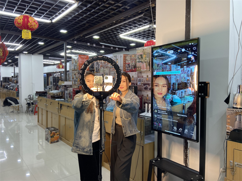 “市面上的五金產(chǎn)品,在我直播間都可以買到,都是‘中國制造’?!敝鞑グ⒁栏駸崮尽す葎e克正在用俄語、哈薩克語等多種語言進行跨境直播帶貨。