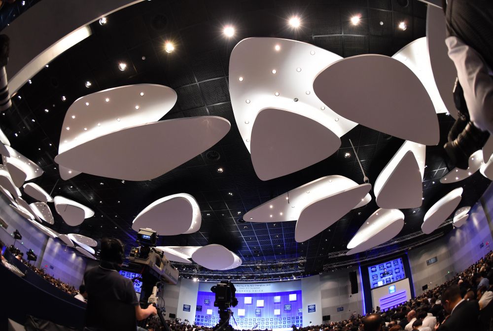 ↑這是2015年9月10日在大連拍攝的夏季達(dá)沃斯論壇開幕全會(huì)現(xiàn)場(chǎng)。