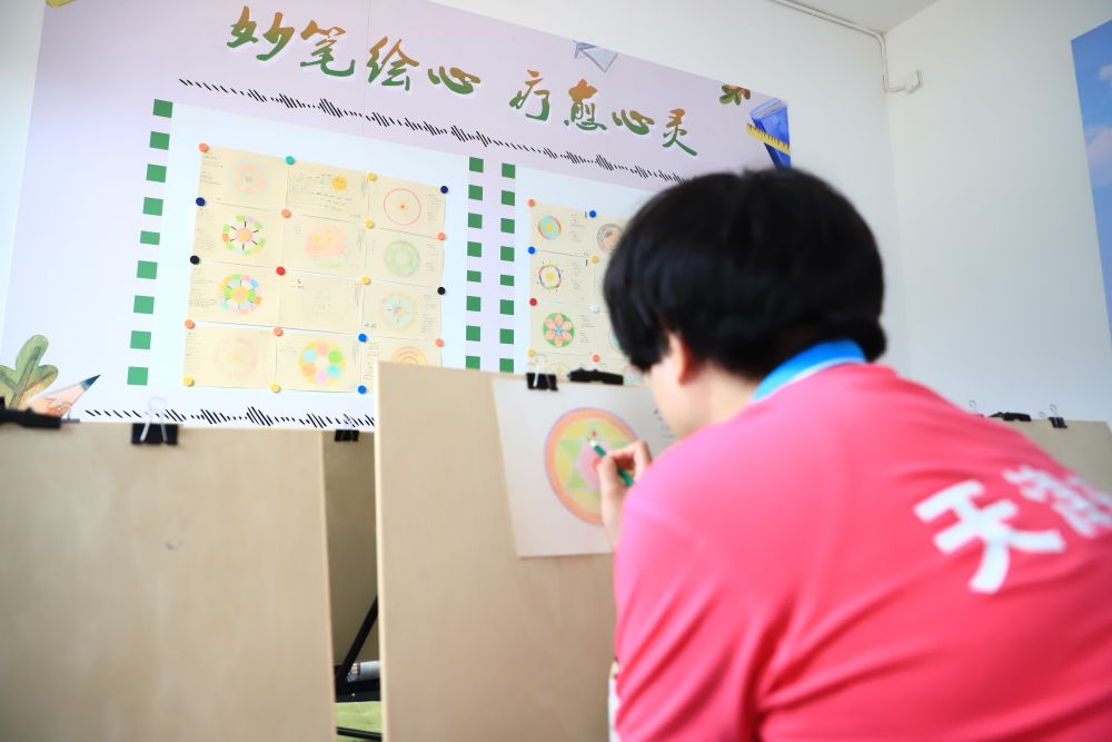 小雪在天津市青泊洼強(qiáng)制隔離戒毒所心理矯治中心繪畫(huà)治療室進(jìn)行繪畫(huà)治療。新華社發(fā)