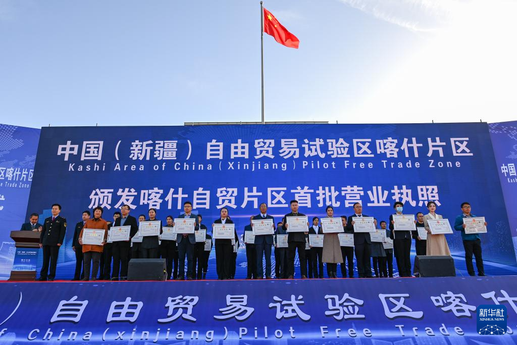 2023年11月11日,在中國(新疆)自由貿易試驗區(qū)喀什片區(qū)揭牌儀式現場,首批入駐自貿片區(qū)的經營主體獲頒營業(yè)執(zhí)照。新華社記者 丁磊 攝