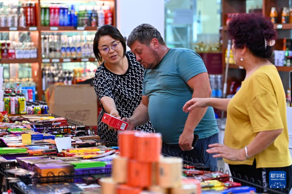 在新疆塔城巴克圖中哈邊民互市絲路文化商品城,一位哈薩克斯坦的游客在選購商品(2023年7月22日攝)。新華社記者 丁磊 攝