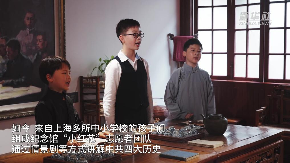 紀念館場景再現(xiàn)廳還原了當(dāng)年廣吉里的會議場景:一塊寫著英文的黑板,長條桌邊圍著一圈木凳。如今,這個場景成為“紅色課堂”,來自上海多所中小學(xué)校的孩子們組成紀念館“小紅花”志愿者團隊,通過情景劇等方式,講解中共四大歷史。