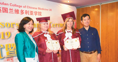 二〇二二年,英國蘭中醫(yī)學(xué)院畢業(yè)典禮。左一為湯淑蘭。