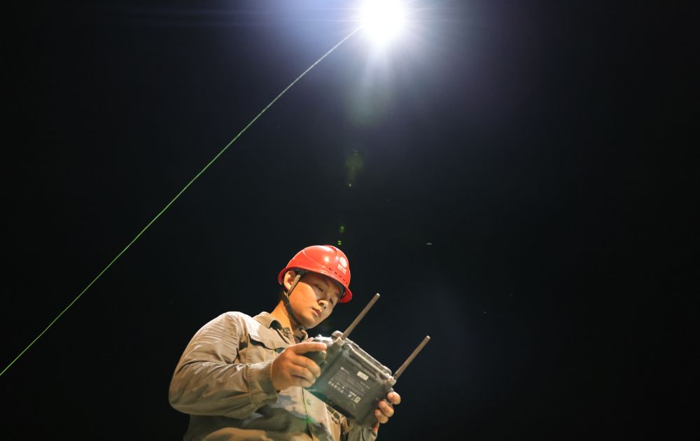 在堵口作業(yè)現(xiàn)場(chǎng),劉子翔負(fù)責(zé)操作系留式無(wú)人機(jī),為施工人員提供夜間照明。他時(shí)刻注意風(fēng)向、風(fēng)速,根據(jù)施工人員的需求,及時(shí)調(diào)整無(wú)人機(jī)的位置,確?!罢盏靡?jiàn)、照得亮”。