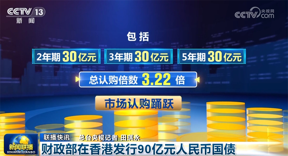 財政部7月10日在香港招標(biāo)發(fā)行2024年第三期人民幣國債,發(fā)行規(guī)模為90億元,包括2年期、3年期、5年期各30億元??傉J(rèn)購倍數(shù)3.22倍,市場認(rèn)購踴躍。今年財政部在香港計劃發(fā)行550億元人民幣國債,進(jìn)一步完善常態(tài)化發(fā)行機(jī)制,支持鞏固提升香港國際金融中心地位。