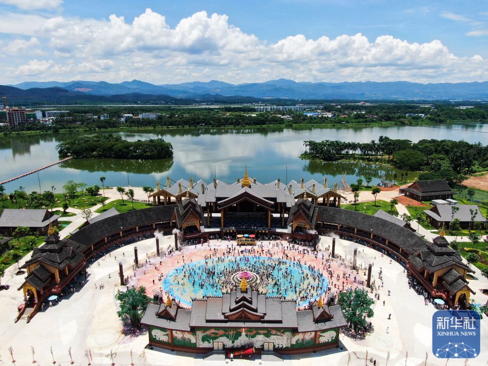 在云南省西雙版納傣族園景區(qū)內(nèi)的傳統(tǒng)傣寨曼聽村,游客參加潑水狂歡活動(無人機照片,7月7日攝)。新華社發(fā)(李云生 攝)