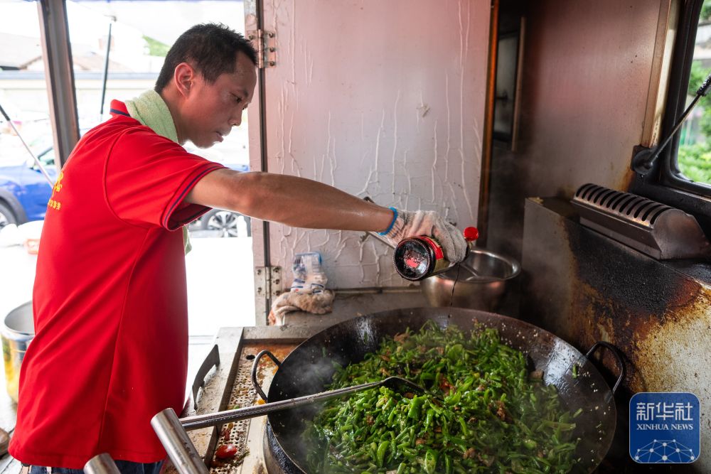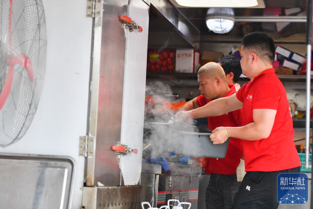 7月8日,在岳陽市良心堡鎮(zhèn)望君洲村,志愿者在炒制菜肴。新華社記者 陳思汗 攝