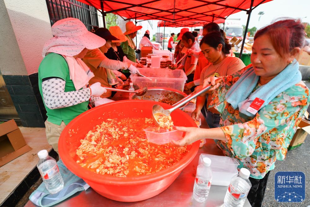7月10日,在岳陽市良心堡鎮(zhèn)望君洲村,志愿者倒出炒好的菜肴準(zhǔn)備打包。新華社記者 陳振海 攝