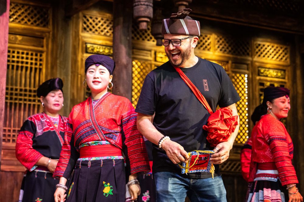 在廣西龍勝黃洛瑤寨,外國(guó)游客與村民演員在紅瑤民俗文化表演中互動(dòng)(6月26日攝)。新華社記者 陳思汗 攝