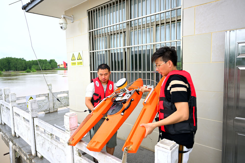 7月14日,王家壩水文站工作人員使用多普勒流速剖面儀測量淮河流量。新華社記者黃博涵 攝