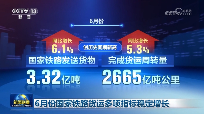 國(guó)鐵集團(tuán)數(shù)據(jù)顯示,6月份,國(guó)家鐵路發(fā)送貨物3.32億噸,完成貨運(yùn)周轉(zhuǎn)量2665億噸公里,同比分別增長(zhǎng)6.1%、5.3%,創(chuàng)歷史同期新高。目前,我國(guó)鐵路貨運(yùn)量、貨運(yùn)周轉(zhuǎn)量等指標(biāo)穩(wěn)居世界首位。
