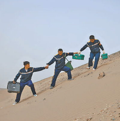 班組成員在翻越沙丘。 2014年,烏魯木齊西車輛段哈密動態(tài)檢測車間哈羅班組正式成立,負(fù)責(zé)維護(hù)哈羅鐵路沿線設(shè)備。10年來,哈羅班組堅守在環(huán)境惡劣、條件艱苦的羅布泊,克服重重困難,做好鐵路巡檢和故障維修,保障鉀肥運輸。 羅布泊,位于新疆東南部塔克拉瑪干沙漠邊緣,天上無飛鳥,地上不長草,只有漫無邊際的沙漠、戈壁、鹽堿灘。 這里一年中有200多天風(fēng)沙肆虐,夏季氣溫超過50攝氏度,冬季氣溫低至零下30攝氏度。這里是中國鐵路烏魯木齊局集團(tuán)有限公司烏魯木齊西車輛段哈密動態(tài)檢測車間哈羅班組工作的地方。 是什么讓他們選擇到羅布泊工作?又是什么工作值得他們在這里堅守10年? “鐵路修到哪兒,人員就要配到哪兒” 嗚—— “火車進(jìn)站了,快!” 哈羅班組工長臺欣龍和伙伴們沖向站臺,幾個人一下子堵在了車門前。 “老吳,這回有啥?” “今兒有羊肉、雞蛋,還有一袋子番茄?!?/p> “嘿嘿嘿?!?/p> 車門旁,幾個大小伙兒咧著嘴憨笑。 臺欣龍工作的地方,叫羅中站,是哈羅鐵路的最后一站,地處羅布泊中心。這里雖通了電、通了水,但米、面、糧、油、飲用水等生活物資全靠火車從400公里外的哈密市送來。 “大小伙兒們,自己搬水?!绷熊囬L老吳一聲令下,臺欣龍和伙伴們麻利地爬上車,一人扛下一桶15升的礦泉水。 “這兒的水堿性大,一燒開,全是白粒粒,沒法喝?!迸_欣龍說,這15升礦泉水得撐一周。 在羅中站,差不多每隔5天會有通勤列車抵達(dá),送來各類物資。 列車停留5小時,隨即返程。羅中站經(jīng)歷短暫的熱鬧后,再次回歸平靜。 除了人少、地荒、物資緊,寂寞、單調(diào)或許是在羅中站工作、生活面臨的最大困難。 這里沒有商店、沒有飯館、沒有影院。白天,手機(jī)還能有網(wǎng)絡(luò)信號,晚上則幾乎沒有信號。乒乓球、象棋以及少量書籍,為臺欣龍和伙伴們提供了少有的娛樂方式。 2014年,中國鐵路烏魯木齊局集團(tuán)有限公司烏魯木齊西車輛段哈密動態(tài)檢測車間哈羅班組正式成立,負(fù)責(zé)維護(hù)哈羅鐵路沿線設(shè)備。當(dāng)年,剛畢業(yè)的臺欣龍來到了這里。 當(dāng)時也沒想太多,覺得在哪里都是干活,就接受了單位安排?!拌F路修到哪兒,人員就要配到哪兒,這活總得有人干。”臺欣龍說。 如今,哈羅班組共有7人,大伙兒隔10天輪一次班。班組里年齡最大的丁鵬今年51歲了,最小的永志帥和杜權(quán)也已31歲。 “假如某個檢測站發(fā)出故障警報,無論什么天氣,都必須立即響應(yīng)” 凌晨3時20分,顛簸了近5個小時,臺欣龍和兩名隊員到達(dá)了黑龍峰動態(tài)設(shè)備檢測站。這里,距離羅中站230公里。 夜間出行,沒有道路、沒有路燈、沒有導(dǎo)航,臺欣龍駕駛著皮卡車朝著鐵路延伸的方向在茫茫戈壁灘里蹚出路。這一路大坑套小坑,人的腦袋時不時頂?shù)杰図敚驳蒙邸?/p> 下了車,風(fēng)裹著沙子打在臉上、頭燈上,幾乎掩蓋了說話聲。時間長了,臺欣龍和隊友們便形成了默契,只需一個手勢,便知道對方的意思。 4時10分,臺欣龍和隊友開始作業(yè)。 打開紅外線軸溫探測設(shè)備(THDS)的機(jī)蓋,映入眼簾的是一層厚厚的沙塵。臺欣龍熟練地拿出吹風(fēng)機(jī)、毛刷,仔細(xì)清理室外探頭箱里的沙塵,再把黑體(一種檢測設(shè)備)放置在探頭箱上,進(jìn)行溫度檢測校準(zhǔn)。 “我們這里夏季溫度高,若列車輪對軸溫超標(biāo),就有斷軸風(fēng)險,引發(fā)安全事故。檢測儀器必須保證準(zhǔn)確性。”臺欣龍解釋,根據(jù)標(biāo)準(zhǔn),THDS低溫檢測誤差正負(fù)不得超過2攝氏度,高溫時段不得超過3攝氏度。“但我們自己的要求是將誤差控制在1攝氏度?!?/p> 早晨7時,臺欣龍一行結(jié)束檢測任務(wù),踏上了回程路,直到中午12時才趕回駐地。 “今天這一路,算順利的。”臺欣龍說,“假如某個檢測站發(fā)出故障警報,無論什么天氣,都必須立即響應(yīng)?!痹诹_布泊,沙塵暴說來就來,一刮就是三四個小時。有一回,他們遇上特大沙塵暴,風(fēng)暴像堵墻一樣迎面撲來。越野車迎風(fēng)的一側(cè),車漆幾乎全被風(fēng)沙打掉?!靶姨澑浇凶鶚蚝蠡飪涸诶镱^躲了3個多小時?!憋L(fēng)暴過后,衣服上、頭發(fā)上、耳朵里、鼻孔里全都是沙子。一抬腳,鐵道路基上的風(fēng)沙已沒過膝蓋。 還有一次,冬季雪夜,臺欣龍和隊友們?nèi)ヌ幚砭o急故障。大雪的掩蓋,讓茫茫戈壁更難辨認(rèn)方向?!拔覀円徊恍⌒淖咤e了方向,跑了很多冤枉路,最終汽車油料不足,只能請求救援,天亮了才出來?!迸_欣龍說。 “檢修得跟上,為鉀肥運輸做好保障” 無水、無人、無城,哈羅鐵路為何要修往羅布泊? 原來,羅布泊寸草不生的地表之下,藏著世界上最大的硫酸鹽型含鉀鹵水礦床,占全國鉀資源量的三成。 長期以來,我國耕地面積中一半以上缺鉀,偏偏鉀鹽在我國屬稀缺礦種,農(nóng)民此前用的鉀肥,85%以上依賴進(jìn)口。羅布泊的發(fā)現(xiàn),讓許多人興奮不已。 一批批創(chuàng)業(yè)者白手起家,讓羅布泊這個不毛之地長出了世界上最大的硫酸鉀生產(chǎn)廠——國投新疆羅布泊鉀鹽有限責(zé)任公司。最初,這些鉀肥都是通過哈羅公路運出,但隨著產(chǎn)量的提升,公路已無法滿足運輸需求。 哈羅鐵路的建設(shè)因此被提上日程。北起哈密南火車站,途經(jīng)9個車站,直達(dá)羅布泊中心。項目總投