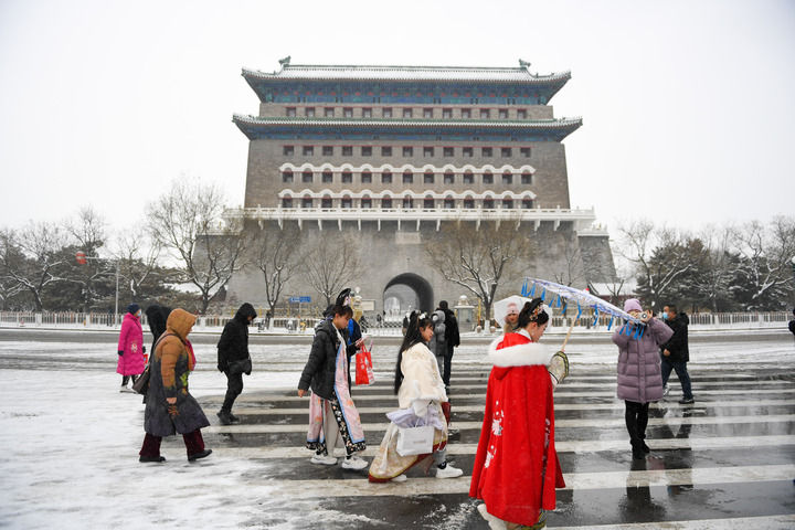 游客行走在雪后的正陽門箭樓前(2023年12月14日攝)。