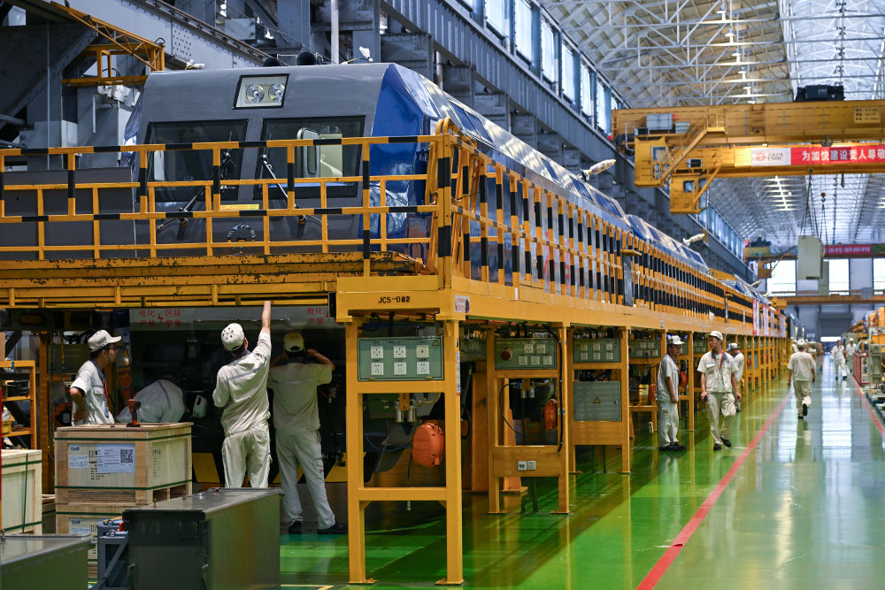 7月26日,中車株機(jī)公司工作人員在總成車間組裝大功率電力機(jī)車。新華社記者 李鑫 攝