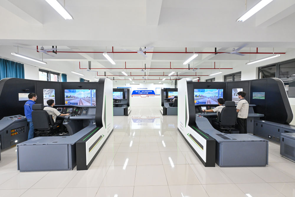 7月26日,湖南鐵道職業(yè)技術(shù)學(xué)院的學(xué)生在產(chǎn)教融合“復(fù)興號(hào)”動(dòng)車組智能駕駛實(shí)訓(xùn)室內(nèi)學(xué)習(xí)動(dòng)車駕駛。 新華社記者 李鑫 攝