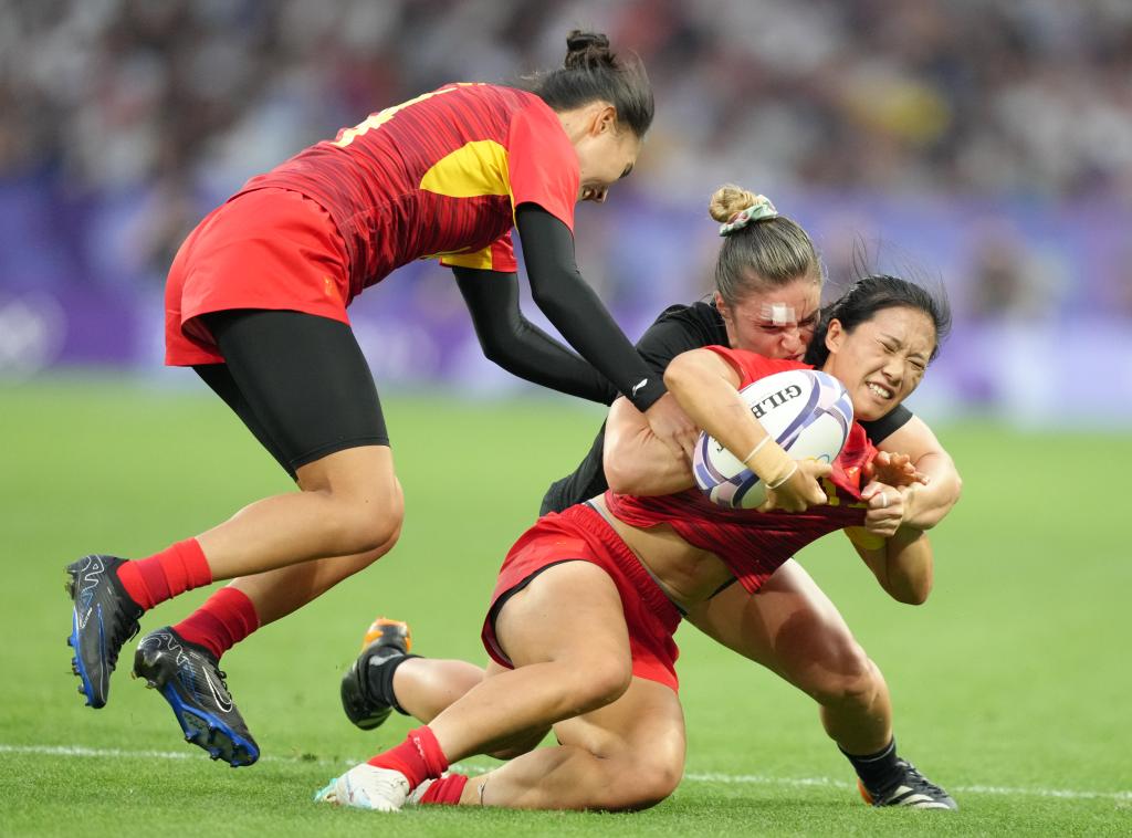 7月29日,中國隊球員胡宇(前)在比賽中。 當(dāng)日,在巴黎奧運(yùn)會七人制橄欖球女子四分之一決賽中,中國隊5比55不敵新西蘭隊。 新華社記者 呂小煒 攝