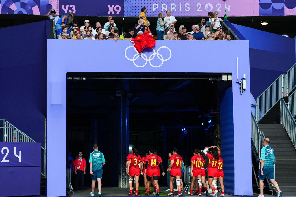 7月29日,中國隊選手劉瀟倩(右三)在賽后退場時向觀眾“比心”。當(dāng)日,在巴黎奧運(yùn)會七人制橄欖球女子四分之一決賽中,中國隊5比55不敵新西蘭隊。 新華社記者 許暢 攝