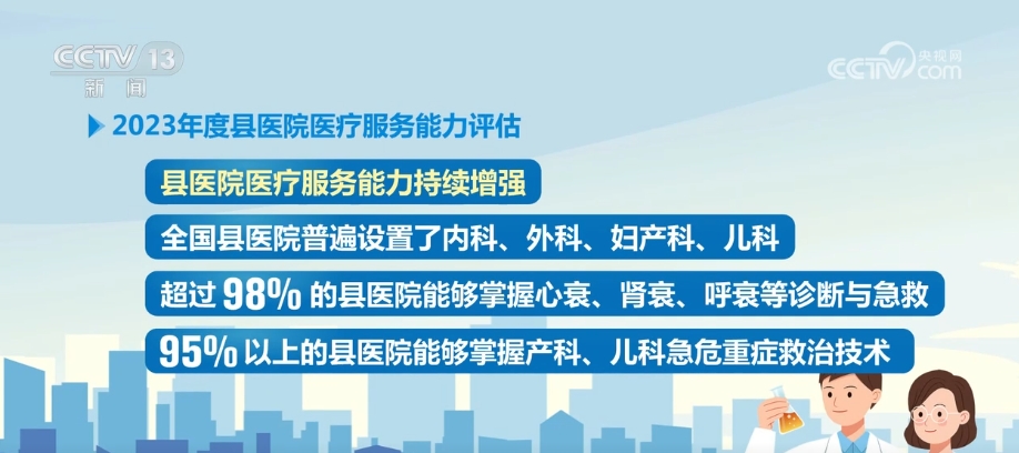 央視網(wǎng)消息:國家衛(wèi)生健康委29日通報了2023年度縣醫(yī)院醫(yī)療服務(wù)能力評估情況,全國共有2062家縣醫(yī)院參與醫(yī)療服務(wù)能力第三方評估,縣域覆蓋率達到98.6%。評估顯示,全國有91.85%的縣醫(yī)院符合基本標準,也就是相當于達到二級醫(yī)院能力,其中符合推薦標準達到三級醫(yī)院能力的占比超過一半。