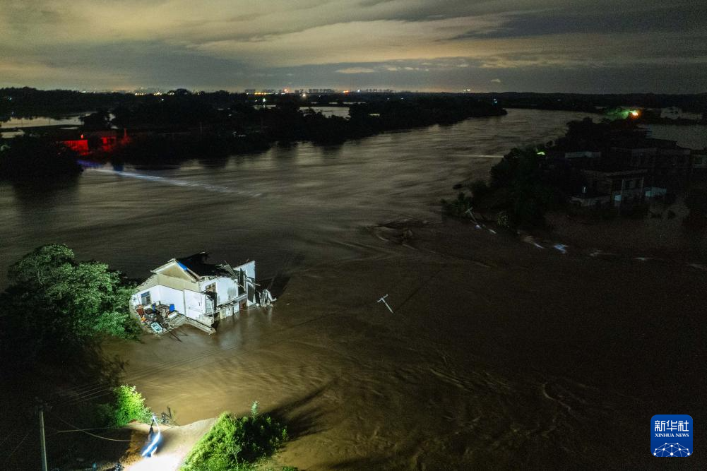 7月29日,在涓水湘潭縣河口鎮(zhèn)華中村堤段附近,搶險人員搜尋被困群眾(無人機照片)。新華社記者 陳思汗 攝