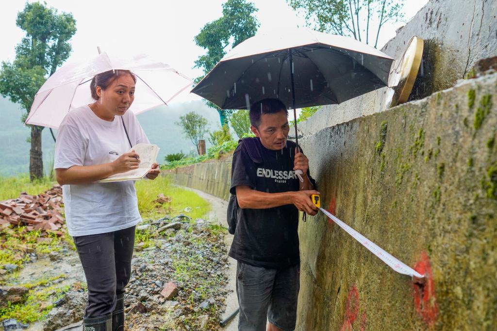 7月30日,富強(qiáng)村村黨支部書記謝小紅(左一)和地質(zhì)災(zāi)害監(jiān)測員魯業(yè)江(右一)一起對富強(qiáng)村一處地質(zhì)災(zāi)害點(diǎn)進(jìn)行測量和監(jiān)測。新華社記者 劉潺 攝