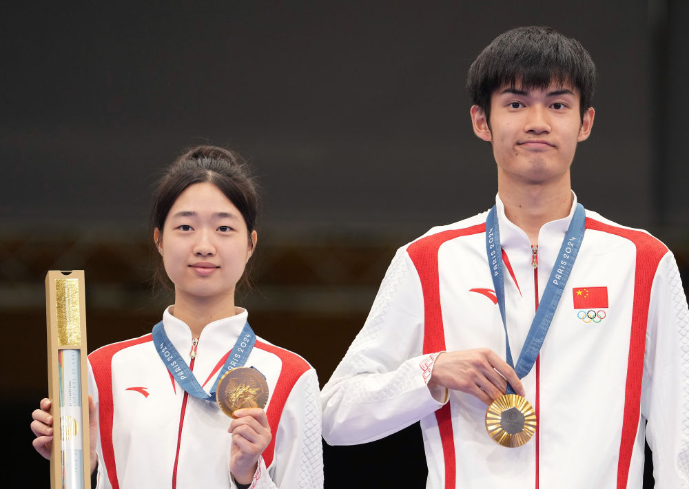 7月27日,冠軍中國(guó)選手黃雨婷(左)/盛李豪在頒獎(jiǎng)儀式上。當(dāng)日,在法國(guó)沙托魯舉行的巴黎奧運(yùn)會(huì)射擊10米氣步槍混合團(tuán)體決賽中,中國(guó)選手黃雨婷/盛李豪奪冠,贏得巴黎奧運(yùn)會(huì)首枚金牌。新華社記者 鞠煥宗 攝