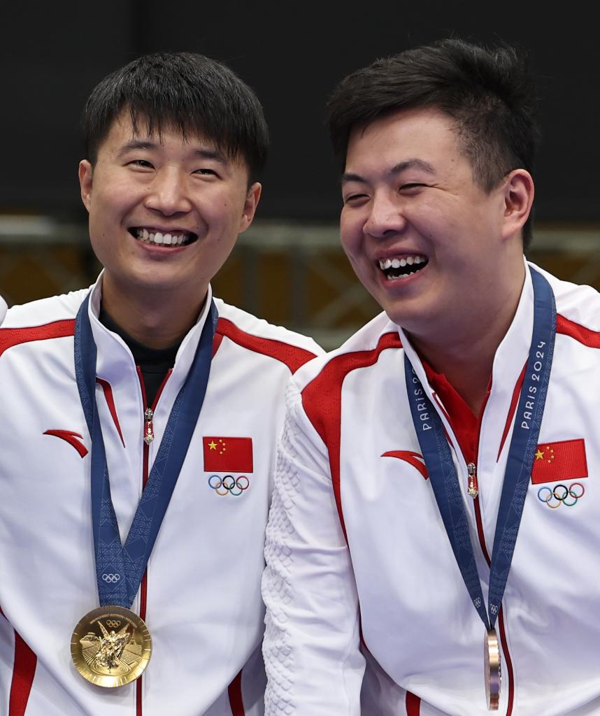 8月5日,冠軍中國選手李越宏(左)和季軍中國選手王鑫杰在頒獎(jiǎng)儀式上。新華社記者 張帆 攝