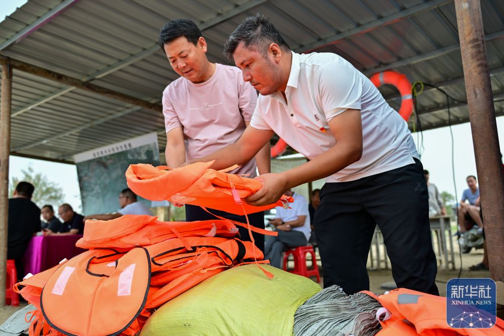 ↑在新疆阿克蘇地區(qū)沙雅縣蓋孜庫(kù)木鄉(xiāng)吐央村,搶險(xiǎn)人員在整理防汛物資(8月3日攝)。