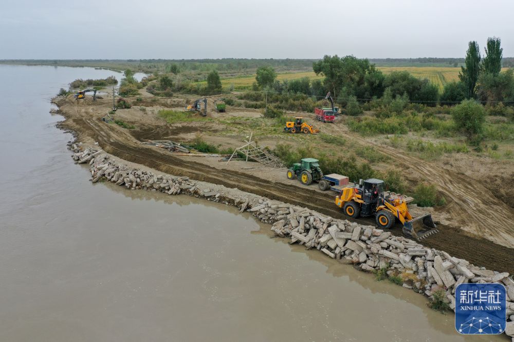 ↑在新疆阿克蘇地區(qū)沙雅縣蓋孜庫(kù)木鄉(xiāng)吐央村,搶險(xiǎn)人員駕駛大型機(jī)械進(jìn)行堤壩加固(8月3日攝,無(wú)人機(jī)照片)。