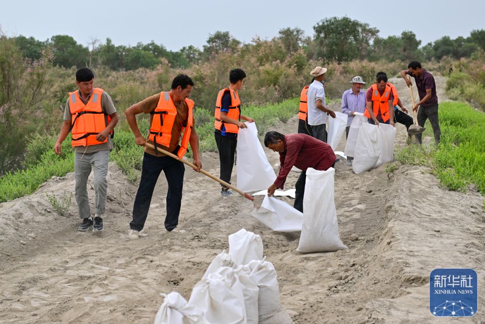 ↑在新疆阿克蘇地區(qū)沙雅縣蓋孜庫(kù)木鄉(xiāng)一處河堤除險(xiǎn)加固現(xiàn)場(chǎng),搶險(xiǎn)人員在裝運(yùn)沙袋(8月3日攝)。