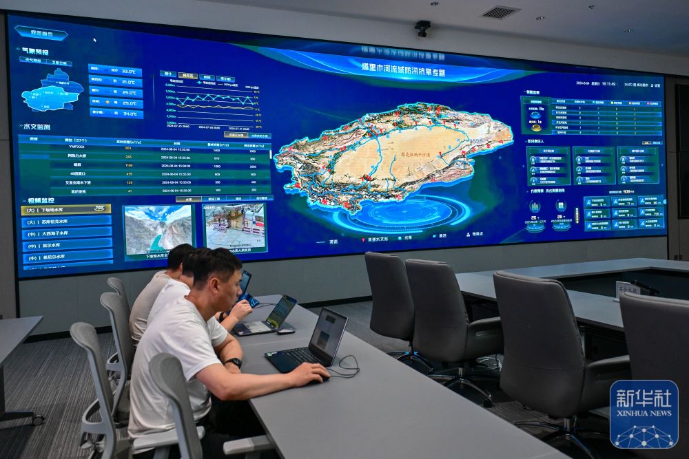 ↑在新疆塔里木河流域管理局,工作人員查看防汛實(shí)時(shí)數(shù)據(jù)(8月4日攝)。