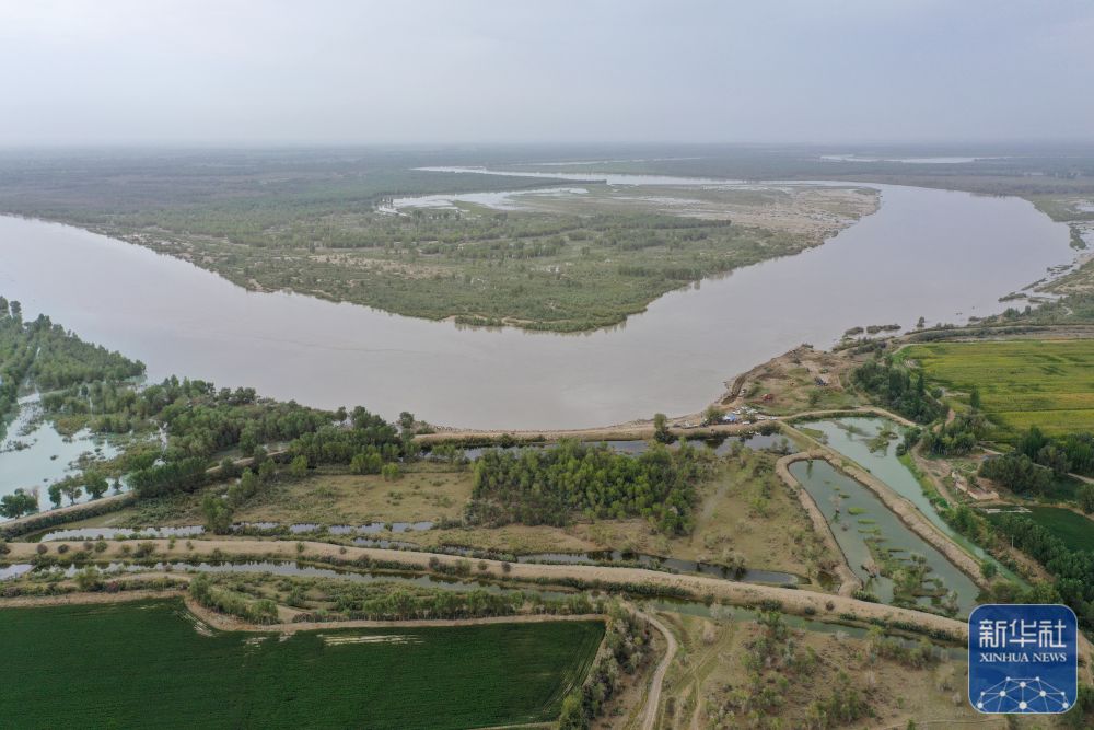 ↑這是在新疆阿克蘇地區(qū)沙雅縣拍攝的塔里木河。幾字形的回水灣,距離最近的農(nóng)田不足50米(8月3日攝,無(wú)人機(jī)照片)。