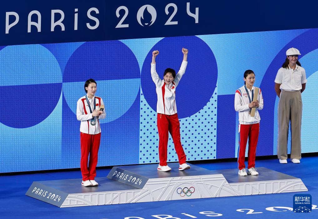 8月6日,冠軍中國選手全紅嬋(前中)、亞軍中國選手陳芋汐(前左)、季軍朝鮮選手金姬燕(前右)在頒獎(jiǎng)儀式上。新華社記者 張玉薇 攝