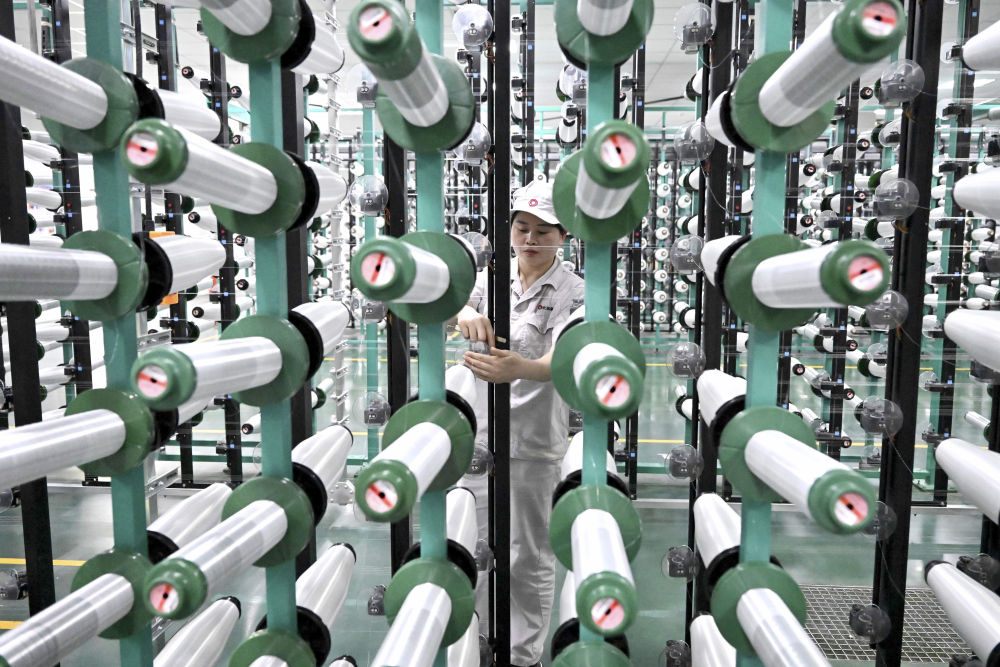 在位于河南安陽林州市的河南光遠(yuǎn)新材料股份有限公司電子布準(zhǔn)備車間,工作人員在檢查整經(jīng)機(jī)機(jī)臺(tái)(2024年2月22日攝)。該公司通過自主技術(shù)創(chuàng)新,攻克“卡脖子”技術(shù),研發(fā)出5G用低介電電子紗、5G用超薄電子布等產(chǎn)品。新華社記者 李安 攝