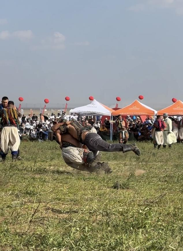 阿斯琴:包括腰力、轉(zhuǎn)動能力和手臂的力量。(牧民的傳統(tǒng))馴馬、馴牛、馴駱駝,不能用蠻力,要有巧勁,要有這方面的天賦才行。比賽規(guī)則就是單排淘汰,倒了就不能再上了。一跤定勝負,這是它摔跤的特點。