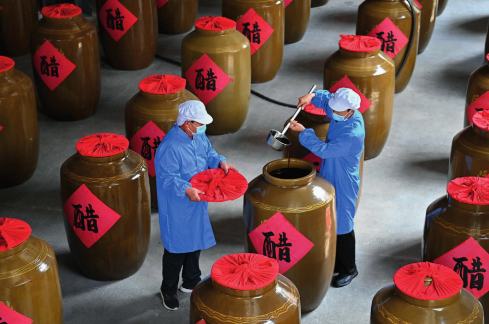 工作人員在山西省長(zhǎng)治市平順縣龍溪鎮(zhèn)龍鎮(zhèn)村農(nóng)旅產(chǎn)業(yè)融合發(fā)展示范園內(nèi)查看醋的成色(2024年5月10日攝) 楊晨光攝/《瞭望》