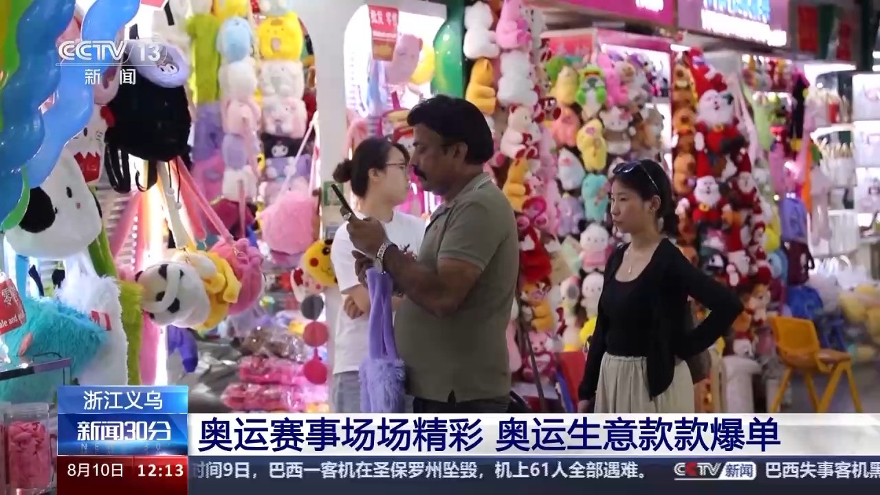 搭乘奧運東風的不僅是體育健兒的同款配飾,奧運周邊產品也備受市場青睞。在義烏國際商貿城,這里匯集26個大類、210多萬種商品,不僅滿足了全球觀眾和參賽者的需求,也給義烏商家?guī)砹嗣黠@的經濟效益。
