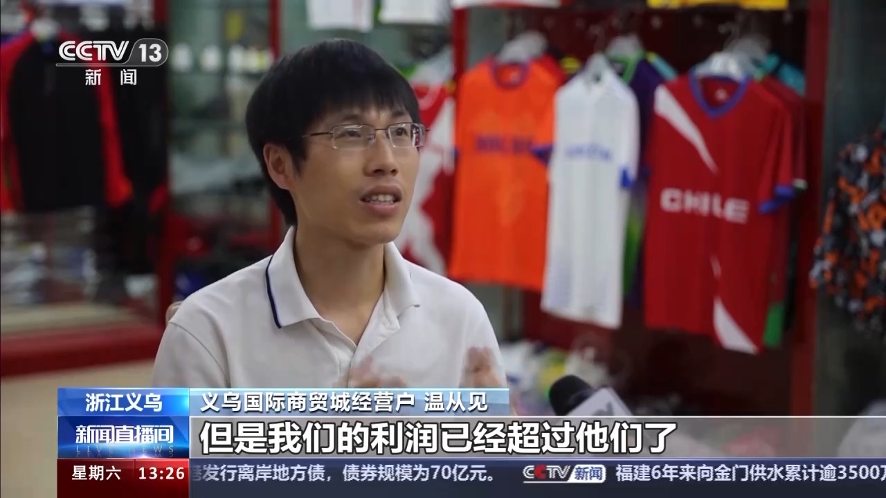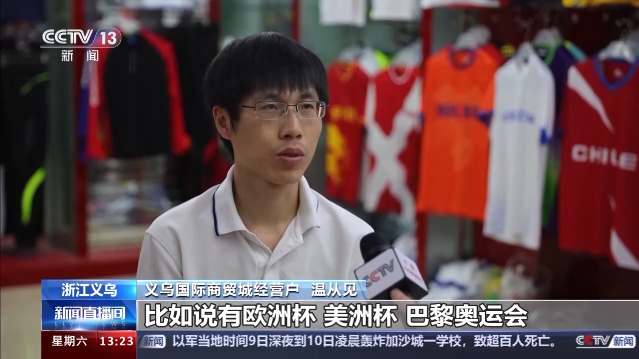 義烏國際商貿城經營戶 溫從見:今年因為是世界大賽年,比如說有歐洲杯、美洲杯、巴黎奧運會,差不多3月份開始,我們就已經著手開始接單、打樣、生產這一系列的運動服飾。我們總共3個賽事下來銷了30萬件左右。