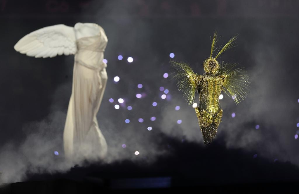 夜幕降臨,法蘭西體育場進(jìn)入另一個時空——一個奧運(yùn)會消失的世界。金色旅行者從天而降,隨著他的腳步,人們踏上一場夢幻般的探索。希臘國旗、奧運(yùn)五環(huán)……與奧林匹克相關(guān)的遺跡逐漸被發(fā)掘。