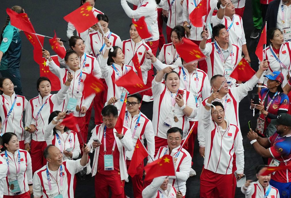 21時15分,各代表團(tuán)旗手入場,運(yùn)動員們也在觀眾巨大的歡呼聲中走向?qū)儆谒麄兊臍g慶時刻。過去十幾天里,200多個代表團(tuán)的上萬名運(yùn)動員,在賽場書寫了一個個努力拼搏、超越自我的故事,他們的友好交流創(chuàng)造出一幅幅美麗畫卷。