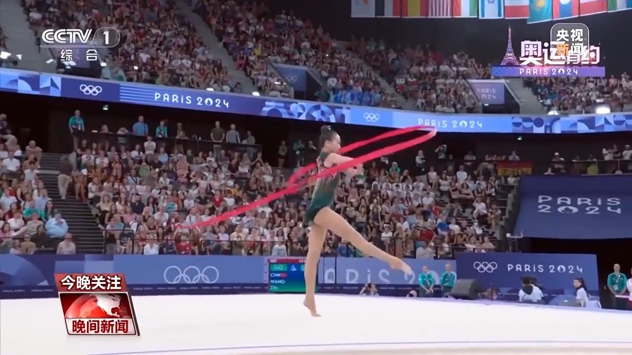 而在藝術(shù)體操女子團體全能決賽中,中國藝術(shù)體操的姑娘們以總分69.8分,拿下該項目的金牌。在決賽三帶兩球項目《鳳鳴凌霄》表演中,伴隨著動聽的音樂,姑娘們靈活地運用彩帶和球,以精準的動作、極具張力的表演,詮釋了漢唐國風的民族美學。