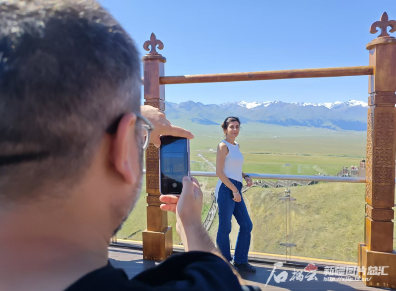 土耳其媒體人士在那拉提旅游風(fēng)景區(qū)合影留念。石榴云/新疆日報(bào)記者 宋海波攝